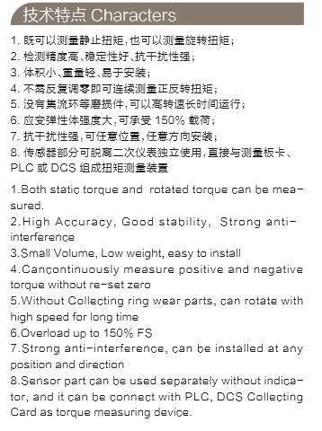 检测电动机、内燃机等旋转动力设备,输出扭矩及功率;检测各种机械加工中心、自动机床的工作过程中的扭矩;检测各种旋转动力设备系统所传递的扭矩及效率;可用于制造粘度计、电动、气动、液力扭力扳手;